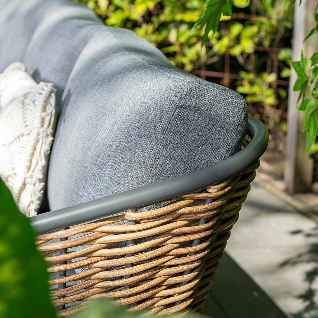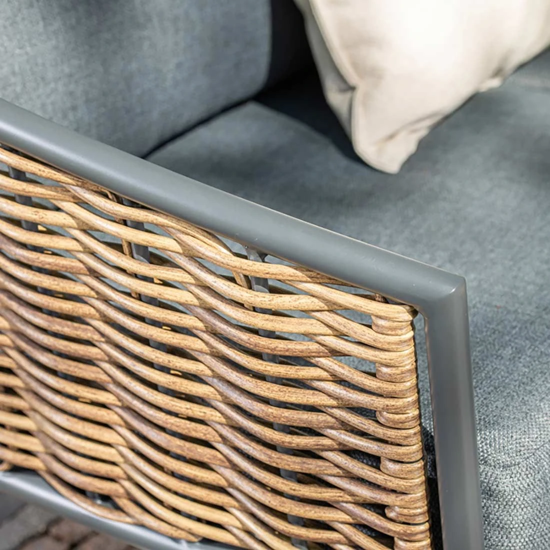 Das Gestell wird aus Aluminium in der Farbe Carbon Black gefertigt. Das Gestell, das mit hochwertigem Rattan umflochten ist, bringt ein exklusives Ambiente auf Ihre Terrasse. Dieses Material zeichnet sich durch eine hohe Wetterbeständigkeit aus.