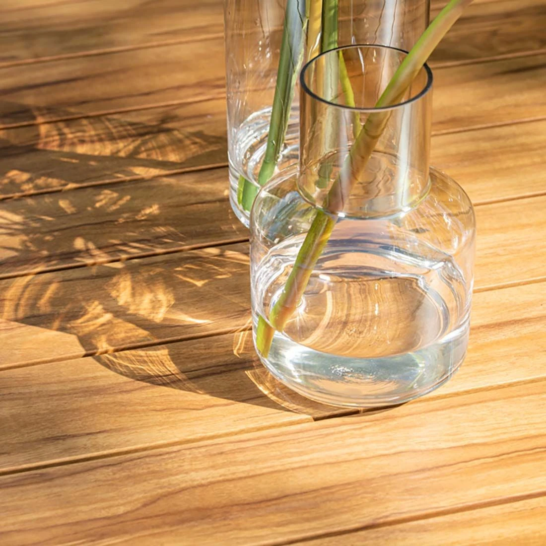 Der Bezug der Dininglounge ist aus Polyester gefertigt. Auch wenn der Bezugsstoff Wind und Wetter trotzen kann, empfehlen wir, abnehmbaren Kissen bei länger andauernder Feuchtigkeit und im Winter drinnen zu lagern. Das Material, das für die Tischplatte verwendet wird, heißt „Imo-Wood“. Dabei handelt es sich um einen künstlich hergestellten Werkstoff, dessen Optik an Holz erinnert, jedoch auch nach langjähriger Nutzung nicht arbeitet und keine Risse aufweist, wie sie bei natürlichem Holz entstehen können. Die Platte aus Imo-Wood ist dadurch wetter- und kältefest und damit die perfekte Outdoor-Tischplatte.