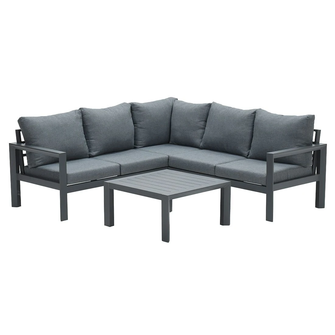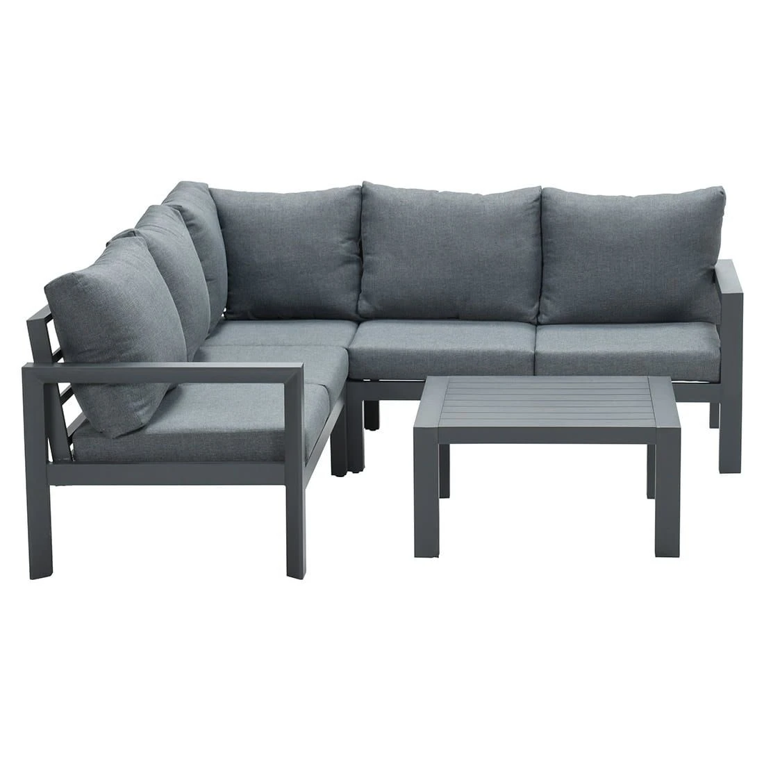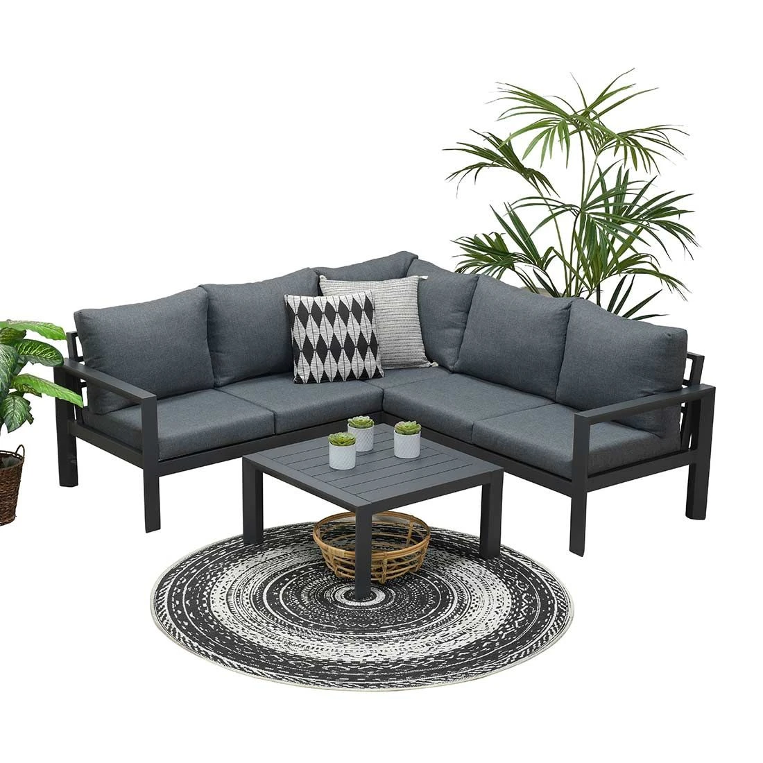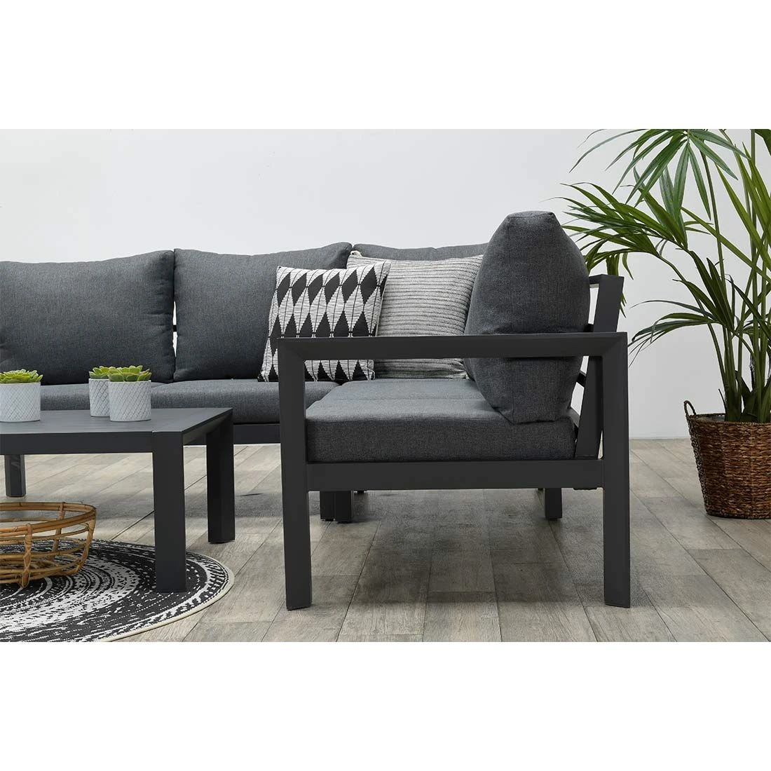 Das Gestell und die Tischplatte sind aus Aluminium gefertigt. Damit die Ecklounge optisch ansprechend ist, sind das Gestell und die Tischplatte im Farbton Carbon Black gehalten. Der Bezug der Ecklounge ist aus Polyester gefertigt. Für eine längere Haltbarkeit empfehlen wir bei stärkerem oder lang anhaltendem Regen, die abnehmbaren Kissen im Innenraum zu lagern. Die Farbe des Bezugs ist Mystic Grey.