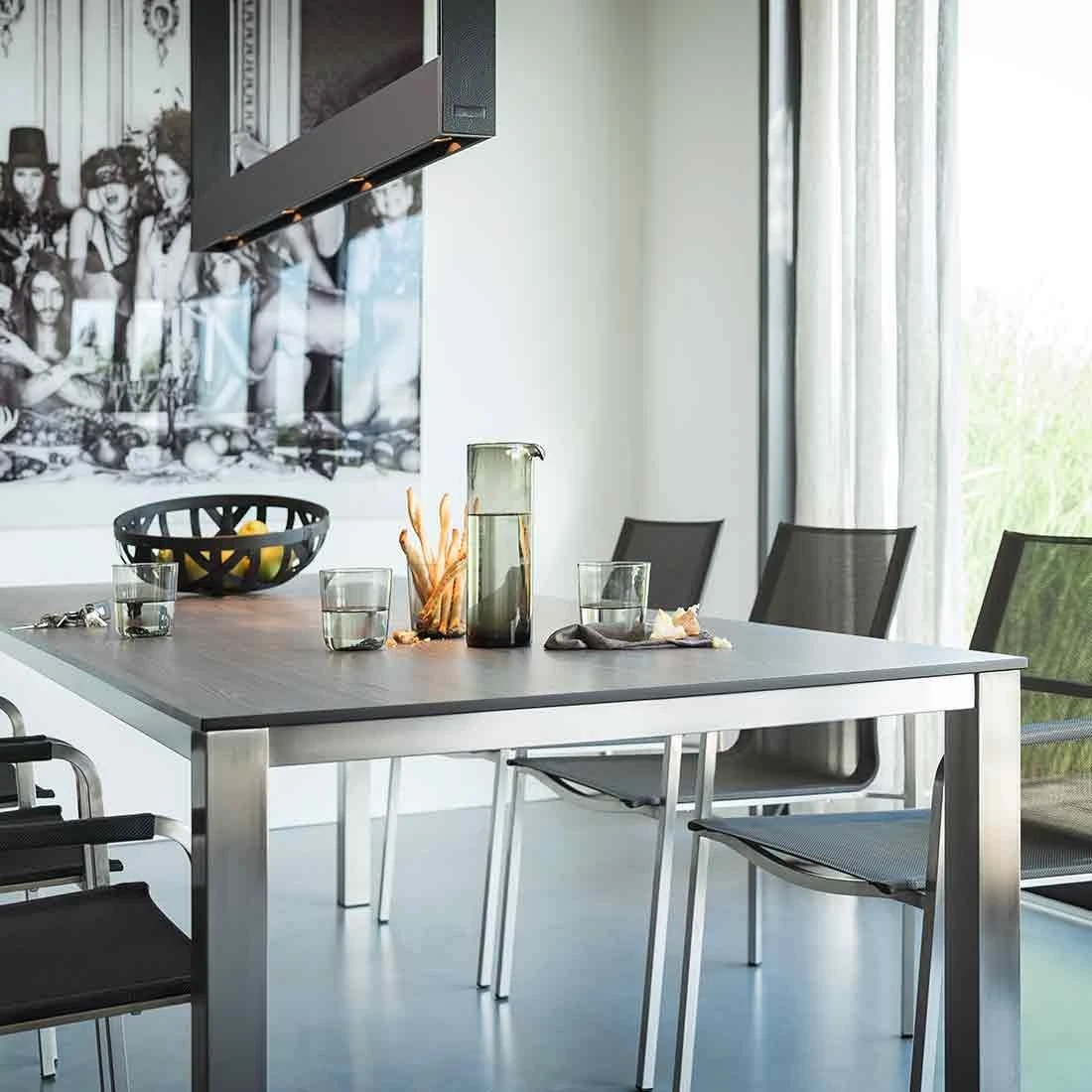 Die Edelstahluntergestelle stehen für den namensgebenden edlen Look und sind durch die hochgradige Wetterfestigkeit für den Außeneinsatz konzipiert. Zudem sind alle Verschraubungen ebenfalls aus Edelstahl.
