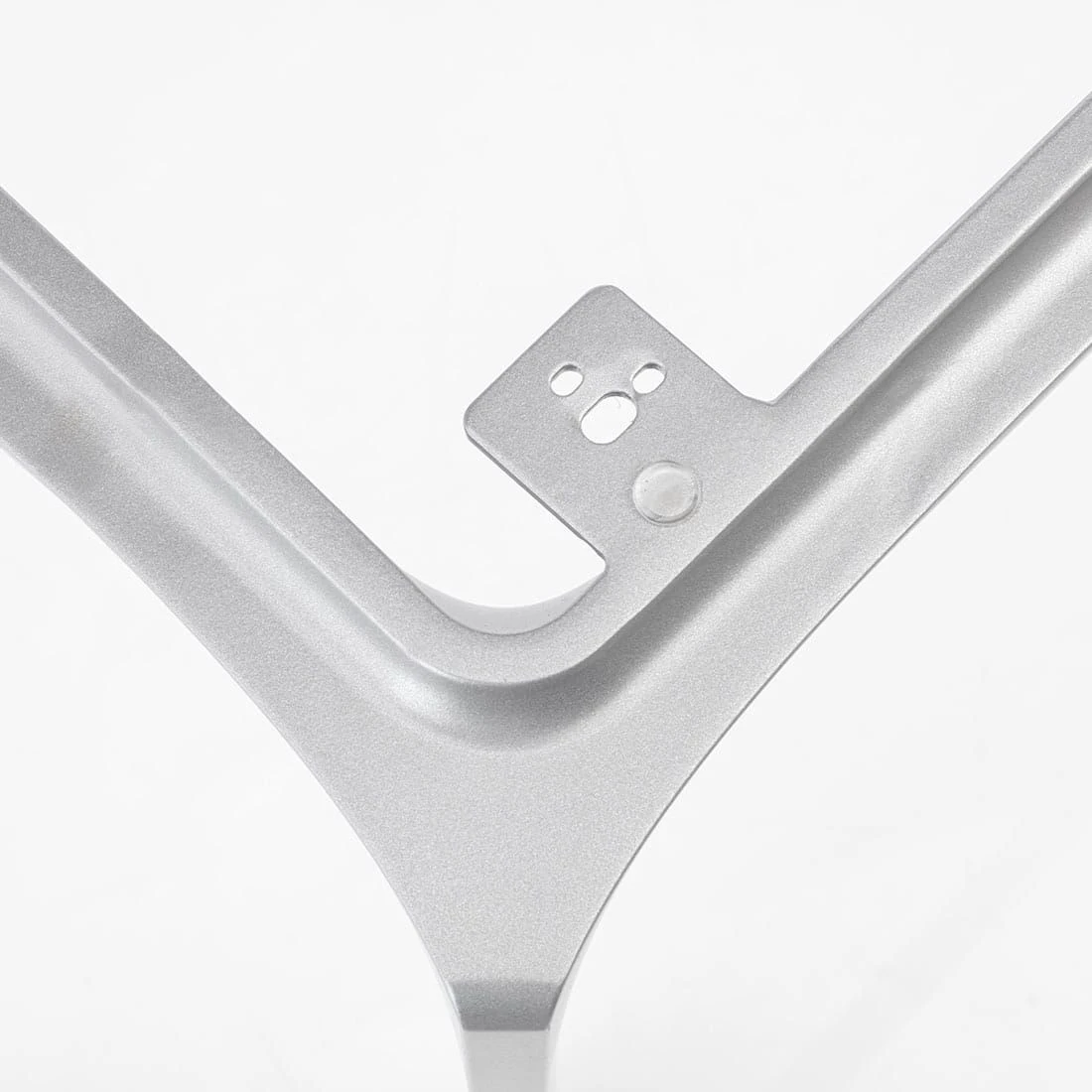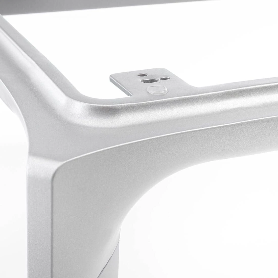 Das Gestell des eleganten Tisches besteht aus Aluminium. Farblich ist das Gestell in Silber gehalten.