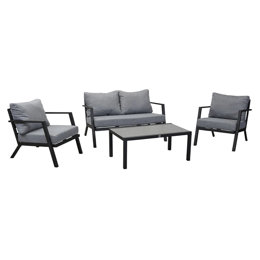 Als Material des Gestells hat der Hersteller qualitativ hochwertiges Aluminium gewählt. Optisch begeistert das Gestell in der Farbe Schwarz. Als klassische Design-Komponente fungiert das geradlinige Vierfußgestell. Für die Bespannung der Sitzfläche wird hochwertiges Textilene verwendet. Es zeichnet sich durch eine hohe Robustheit gegenüber Hitze und Frost aus und ist leicht zu reinigen. Der Bezug des Loungesets ist aus Polyester gefertigt. Für eine längere Haltbarkeit empfehlen wir bei stärkerem oder lang anhaltendem Regen, die abnehmbaren Kissen im Innenraum zu lagern. Die Farbe des Bezugs ist Salz & Pfeffer. Die Tischplatte ist aus edlem Keramik-Glas gefertigt. Im Gegensatz zu vielen anderen Tischplattenmaterialien sind solche Platten äußerst kälte- und hitzebeständig und zählen somit zu den robustesten Tischplatten auf dem Markt.
