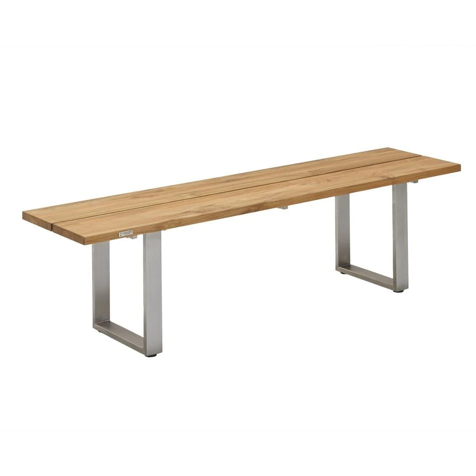 Das Gestell der Gartenbank besteht aus hochwertigem und pflegeleichtem Edelstahl. Neben seiner ansprechenden Optik bietet dieses Material auch eine hohe Stabilität. Farblich ist dieses in Silber gehalten. Als Ergänzung zum Gestell wartet die Gartenbank mit einer Sitzfläche aus Teakholz auf. So gelingt es, das Möbelstück mit einer guten Wetterfestigkeit besonders robust zu gestalten. Die Sitzfläche ist in ansprechendem Teak Natur gehalten.