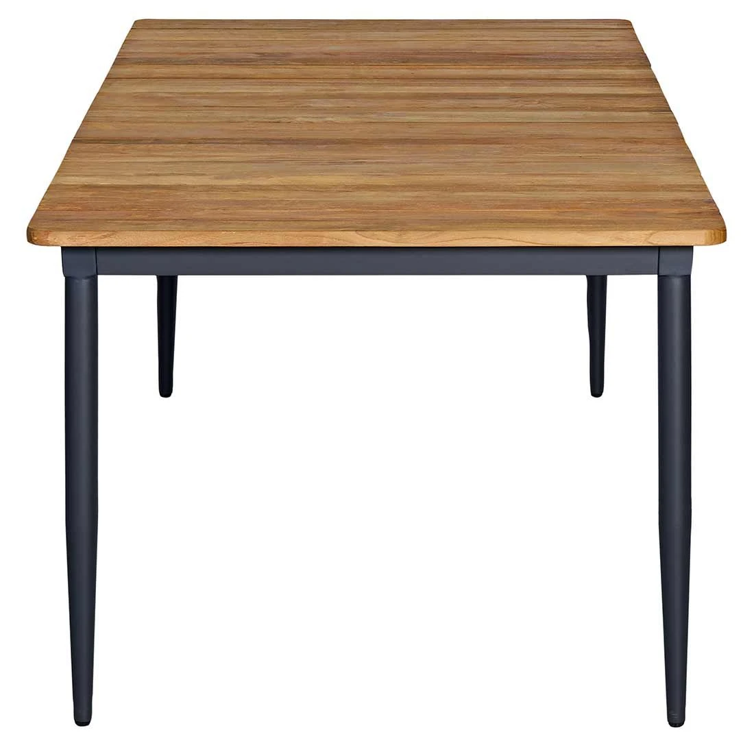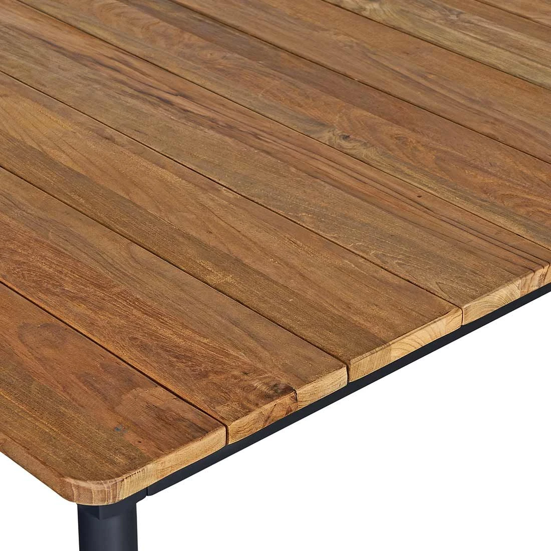 Zum Lieferumfang des Sets gehört auch ein praktischer Tisch. Die Gebrauchsspuren in der Tischplatte sind Teil der Formensprache der Tischplatte. Denn diese ist aus wiederverwertetem Teak gearbeitet, das zuvor aus alten Hütten und Booten gewonnen wurde. Bei der Aufarbeitung werden dann Einkerbungen, Nagellöcher und Co. bewusst erhalten. Jede Tischplatte und damit jeder Gartentisch ist also ein Unikat. Klassisch aus vier Tischbeinen besteht das Gestell des Tisches. Der Tisch ist klassisch rechteckig gestaltet.