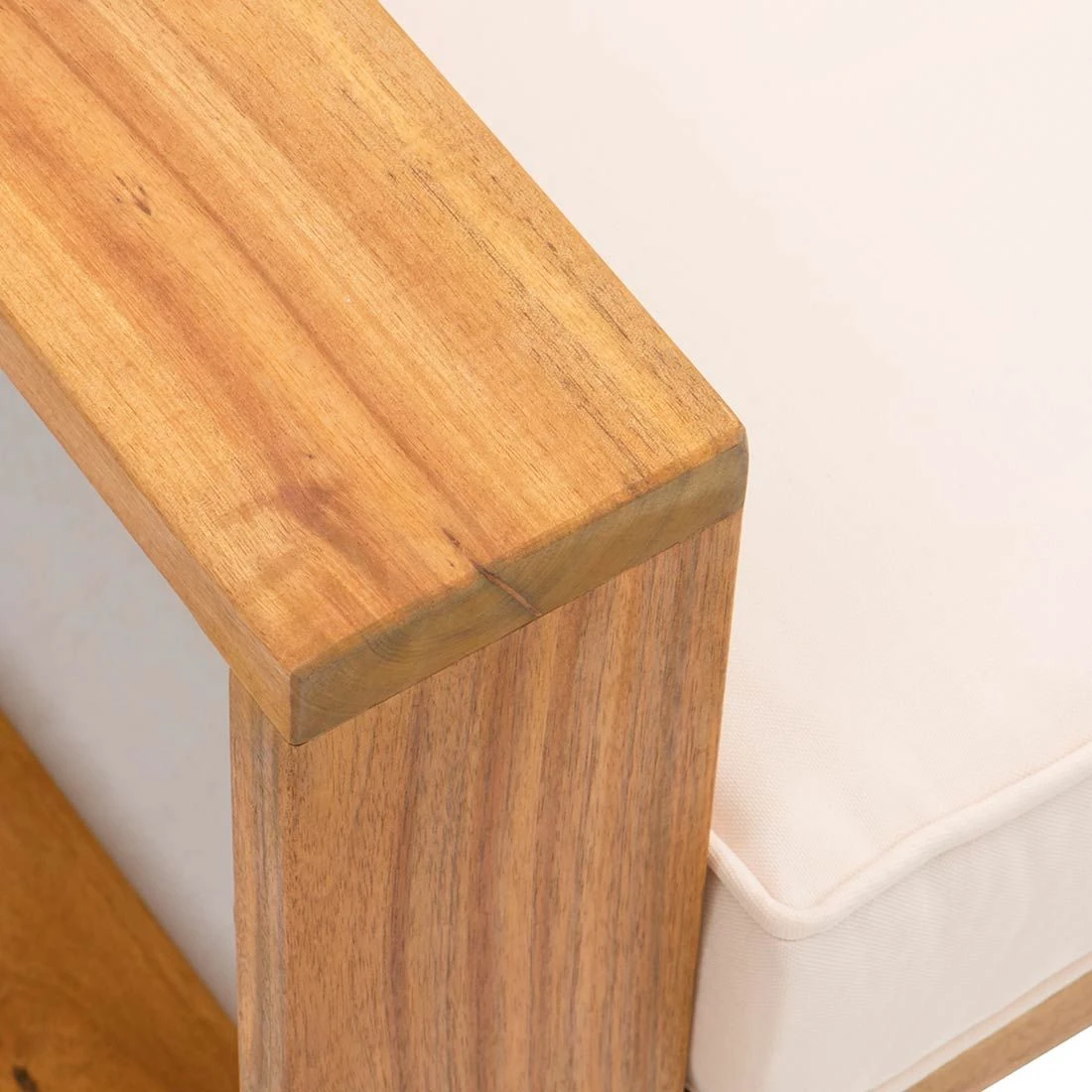 Für das Gestell und die Sitzfläche kommt Akazienholz zum Einsatz. Damit das Gartensofa optisch ansprechend ist, sind das Gestell und die Sitzfläche im Farbton Natur gehalten. Der Bezug des Gartensofas ist aus Polyester gefertigt. Auch wenn der Bezugsstoff Wind und Wetter trotzen kann, empfehlen wir, abnehmbare Kissen bei länger andauernder Feuchtigkeit und im Winter drinnen zu lagern. Die Farbe des Bezugs ist Ecru.