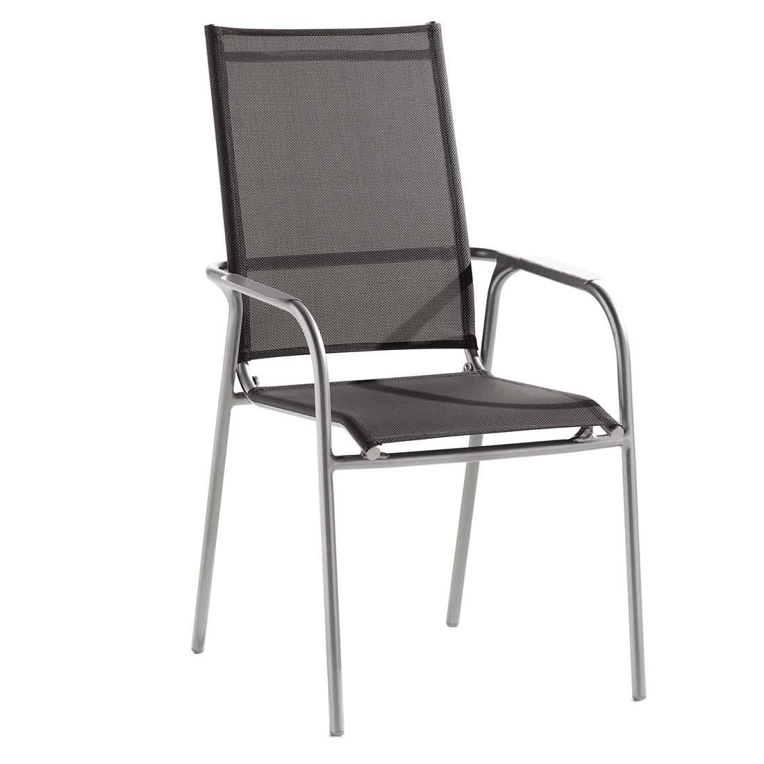 Das Gestell wird aus Aluminium gefertigt. Das geringe Eigengewicht des Materials macht den Stapelsessel zu einem robusten, aber dennoch leicht zu transportierenden Sitzmöbel auf Ihrer Terrasse. Für eine attraktive Optik ist das Gestell im Farbton Eisengrau (Anthrazit) gehalten. Für die Bespannung der Sitzfläche verlässt sich der Hersteller auf hochwertiges Textilene. Es zeichnet sich durch eine hohe Robustheit gegenüber Hitze und Frost aus und ist leicht zu reinigen. Die Farbgestaltung der Sitzfläche in Silbergrau ist äußerst ansprechend.