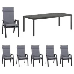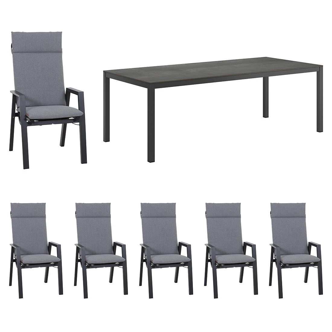 Das Gestell ist aus Aluminium gefertigt. Dadurch lassen sich die Möbel leicht von einem Standort zum nächsten transportieren und sind dennoch sehr stabil. Ein weiteres Highlight der Sitzmöbel ist die Bespannung der Sitzflächen mit Textilene in der Farbe Dunkelgrau. Dieses Material zeichnet sich durch eine hohe Robustheit gegenüber Hitze und Frost aus und ist leicht zu reinigen.