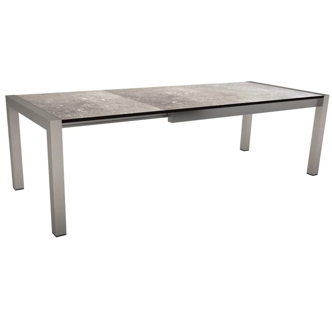 Das Gestell ist aus rostfreiem und pflegeleichtem Edelstahl gefertigt und äußerst windsicher auf der Terrasse. Klassisch aus vier Tischbeinen besteht das Gestell des Tisches. Farblich ist die Tischplatte in einem schönen Vintage Stone gehalten. Die rechteckige Form ermöglicht es Ihnen, den Ausziehtisch in Ecken und an Häuserwänden platzsparend einzusetzen.