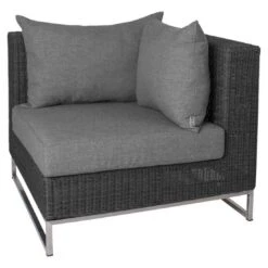 Der Korpus und die Sitzfläche sind aus Polyrattan-Geflecht gefertigt. Damit das Eck-/Endmodul optisch ansprechend ist, sind der Korpus und die Sitzfläche im Farbton Basaltgrau gehalten. Das Gestell ist aus hochwertigem, rostfreiem Edelstahl hergestellt. Durch das etwas höhere Eigengewicht steht das Eck-/Endmodul besonders stabil und windsicher auf der Terrasse. Optisch begeistert das Gestell in der Farbe Silber. Die Farbe des Bezugs ist Seidengrau.