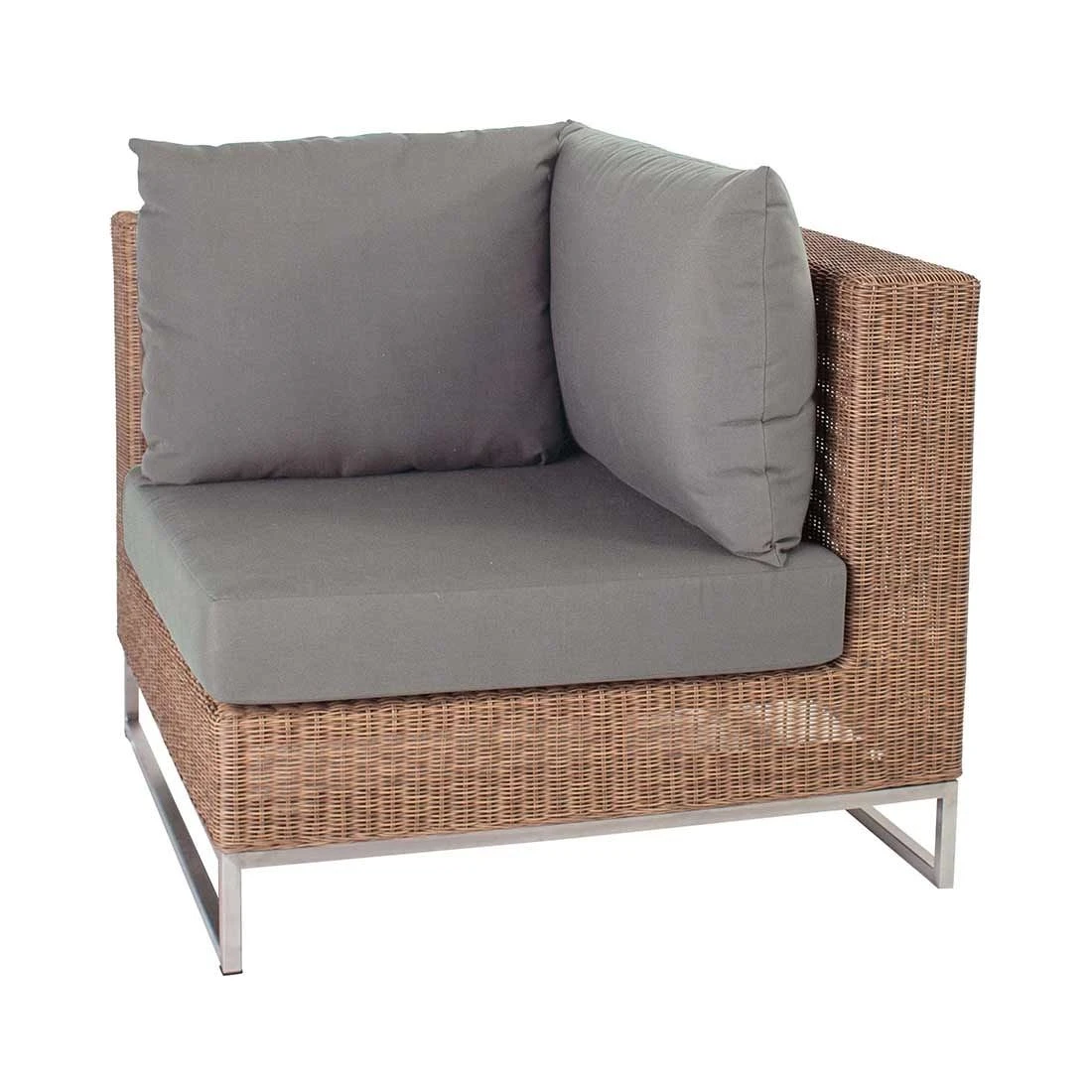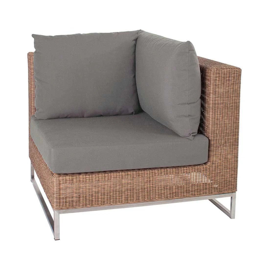 Für den Korpus und die Sitzfläche kommt Polyrattan-Geflecht zum Einsatz. Damit das Eck-/Endmodul optisch ansprechend ist, sind der Korpus und die Sitzfläche im Farbton Zimt gehalten. Das Gestell des Eck-/Endmoduls besteht aus pflegeleichtem, rostfreiem Edelstahl. Optisch begeistert das Gestell in der Farbe Silber. Die Farbe des Bezugs ist Rehbraun.