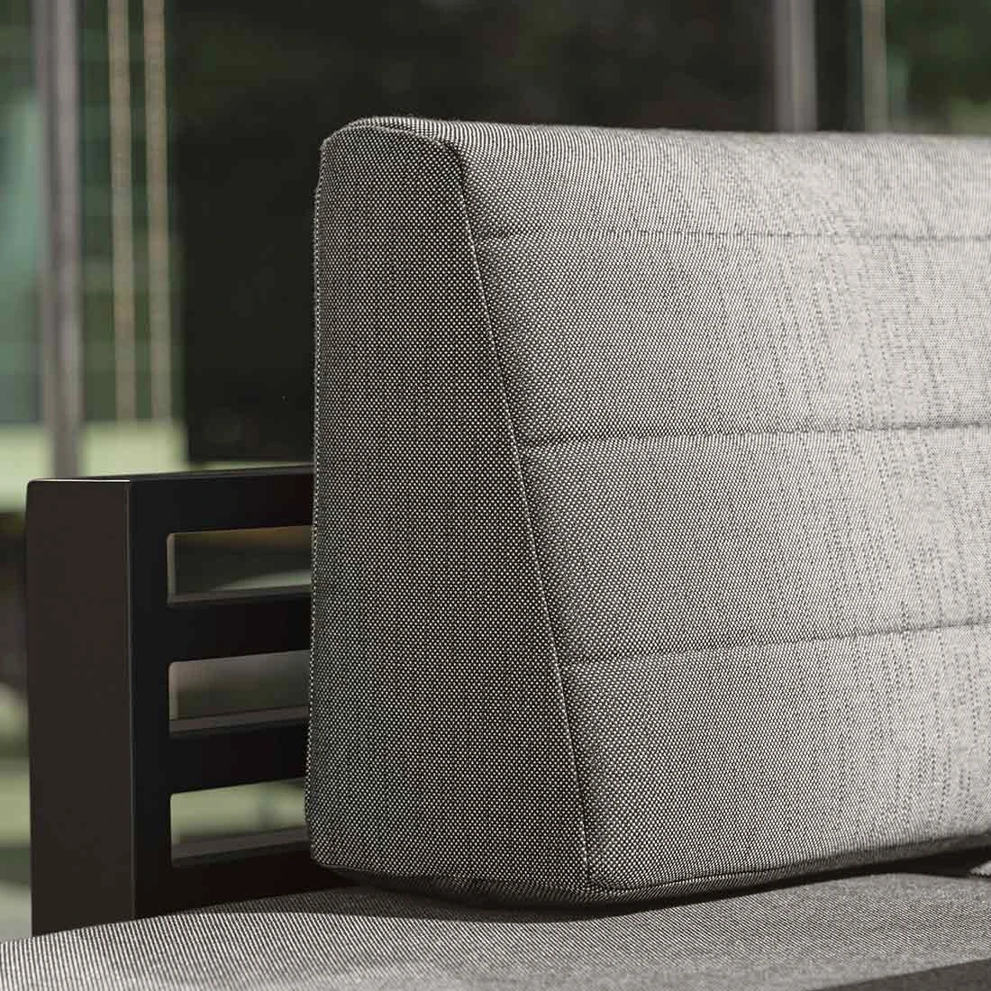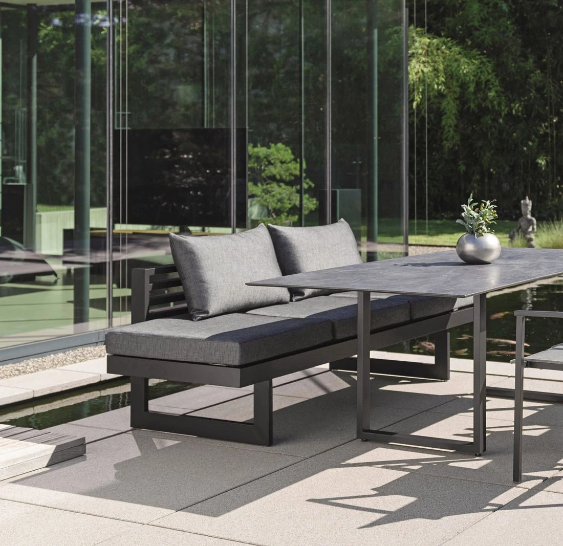 Das Gestell wird aus Aluminium in der Farbe Schwarz Matt gefertigt. Das geringe Eigengewicht des Materials macht die Loungebank zu einem robusten, aber dennoch leicht zu transportierenden Möbel auf Ihrer Terrasse.