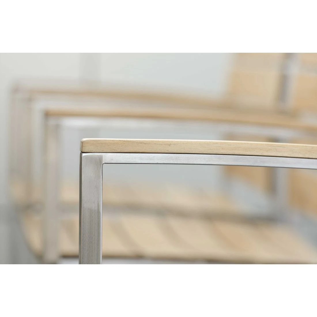 Das Gestell des Stapelsessels besteht aus hochwertigem und pflegeleichtem Edelstahl. Neben seiner ansprechenden Optik bietet dieses Material auch eine hohe Stabilität. Für eine attraktive Optik ist das Gestell im Farbton Silber gehalten. Als Ergänzung zum Gestell wartet der Stapelsessel mit einer Sitzfläche aus Teakholz auf. So gelingt es, das Möbelstück mit hervorragenden Materialeigenschaften besonders robust zu gestalten. Die Farbgestaltung der Sitzfläche in Teak Natur ist äußerst ansprechend.