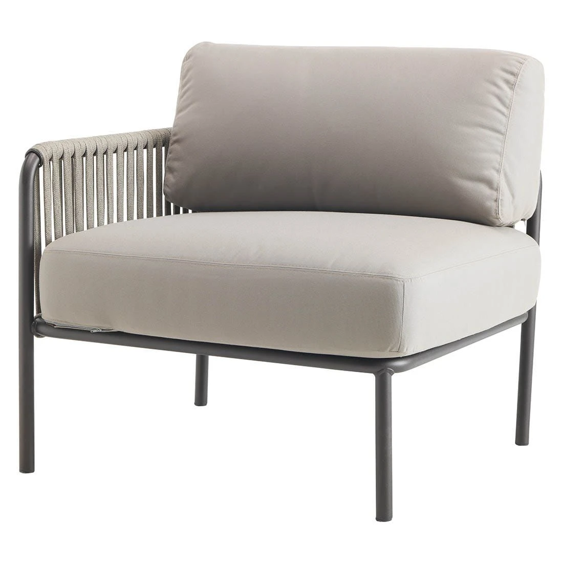 Damit das Eck-/Endmodul optisch ansprechend ist, sind die Sitzfläche und der Bezug im Farbton Grau gehalten. Als stabilen Unterbau wird ein Gestell aus robustem Stahl gewählt. Optisch begeistert das Gestell in der Farbe Schwarz. Farblich ist der Korpus des Eck-/Endmoduls in ansprechendem Taupe gehalten.