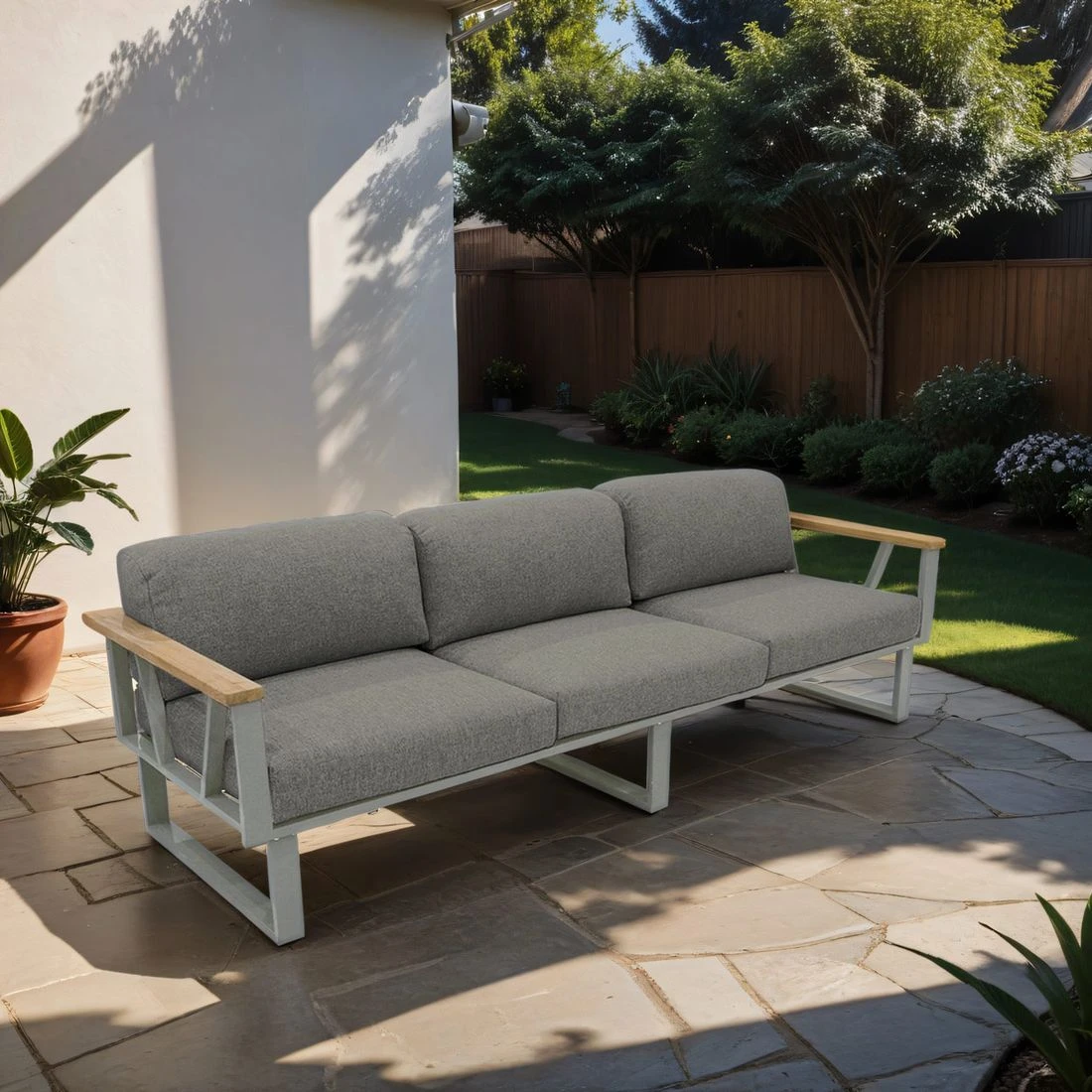 Das Gestell des Gartensofas besteht aus pflegeleichtem, rostfreiem Edelstahl. Optisch begeistert das Gestell in der Farbe Silber. Für die Sitzfläche wurde der spanische Outdoorstoff Tuvatextil verwendet. Das Material ist zusätzlich beschichtet und damit besonders wasserabweisend und schnelltrocknend. Die hohe UV-Beständigkeit lassen die Farben Ihres Möbelstücks lange strahlen.